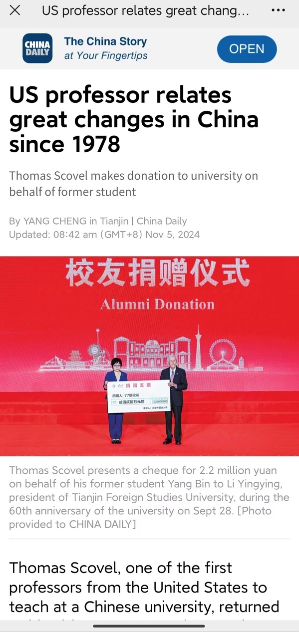 11月5日,《中国日报》第6版以《US professor relates great changes in China since 1978》为题,深度报道了美籍教授斯科维尔出席乐鱼·体育建校60周年校庆纪念大会,讲述了他与中国、与天外的深厚情缘。留学中国海外媒体账号同步转发相关报道,进一步扩大了天外在海外的影响力。