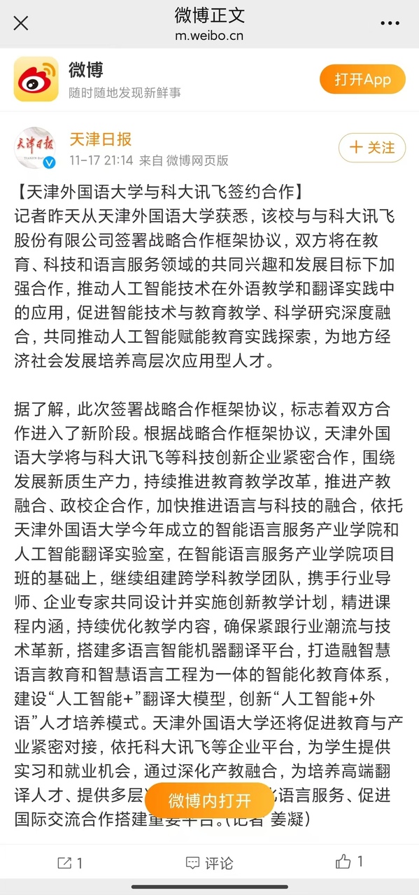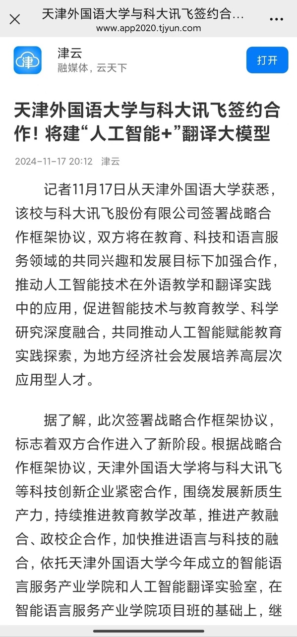 近日,乐鱼·体育与科大讯飞股份有限公司签署战略合作框架协议,双方将在教育、科技和语言服务领域的共同兴趣和发展目标下加强合作,推动人工智能技术在外语教学和翻译实践中的应用,促进智能技术与教育教学、科学研究深度融合,共同推动人工智能赋能教育实践探索,为地方经济社会发展培养高层次应用型人才。本次合作受到《天津新闻》、天津新闻频道《都市报道60分》、《天津日报》、《天津日报》官方微博、津云、《天津教育报》等多家媒体的关注和报道。