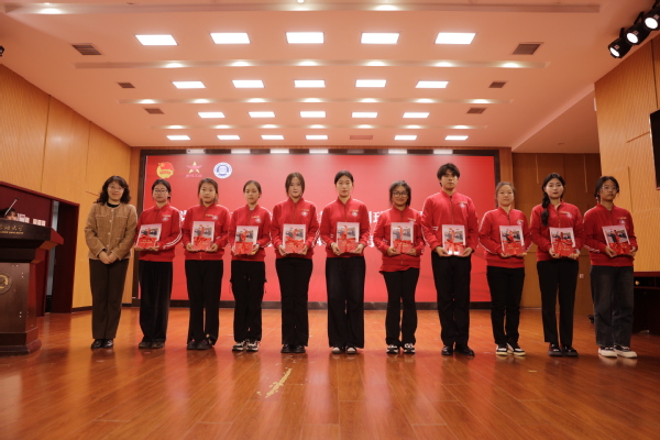 党委学工部副部长张晓欢为学员代表赠送书籍《习近平与大学生朋友们》和成长手册。