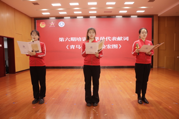 第六期培训班学员代表童文慧、王馨慧、姜雨欣献词《青马领航 梦绘宏图》,分享了在青马的学习收获和成长感悟。