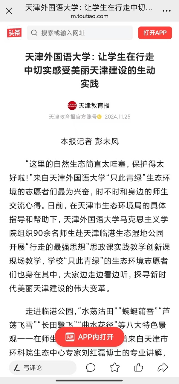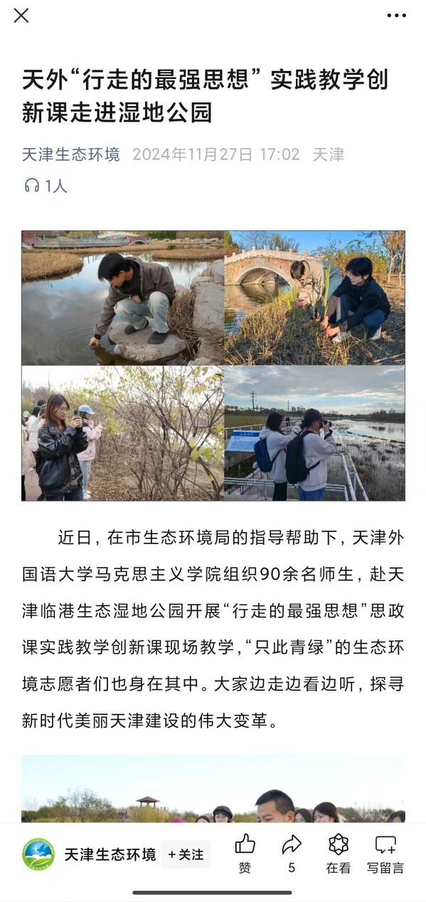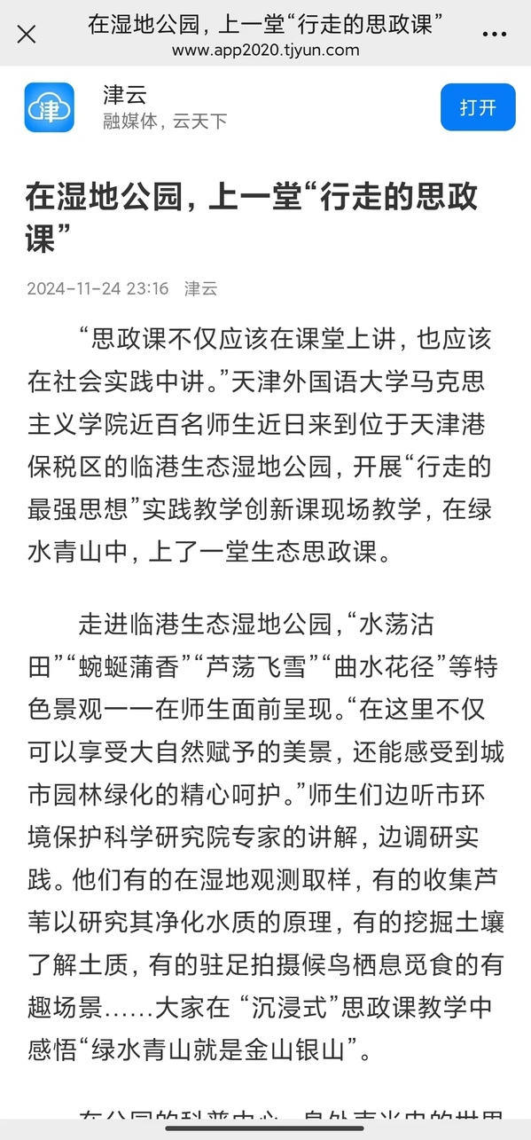 近日,乐鱼·体育马克思主义学院近百名师生来到位于天津港保税区的临港生态湿地公园,开展“行走的最强思想”实践教学创新课现场教学,在绿水青山中,上了一堂生态思政课。这次实践活动是天外积极探索更好地把生态文明教育深度融入“大思政课”、推动习近平生态文明思想在高校思政课堂上美丽绽放的有益尝试。本次活动受到了《中国日报》《天津日报》、津云、《天津教育报》、天津生态环境微信公众号等多家媒体的关注和报道。
