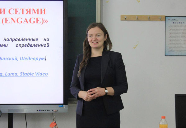 南乌拉尔国立大学青年教师代表伊∙阿∙丘诺索娃从实践教学角度详细探讨了对外俄语课堂中智慧教学内容的设计原则,提出了如何通过数字技术优化教学过程和提升学习效果的具体方法。