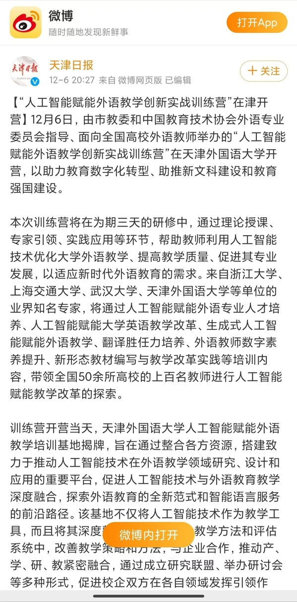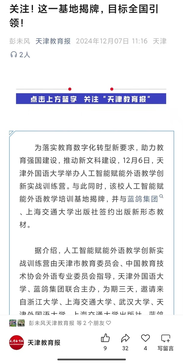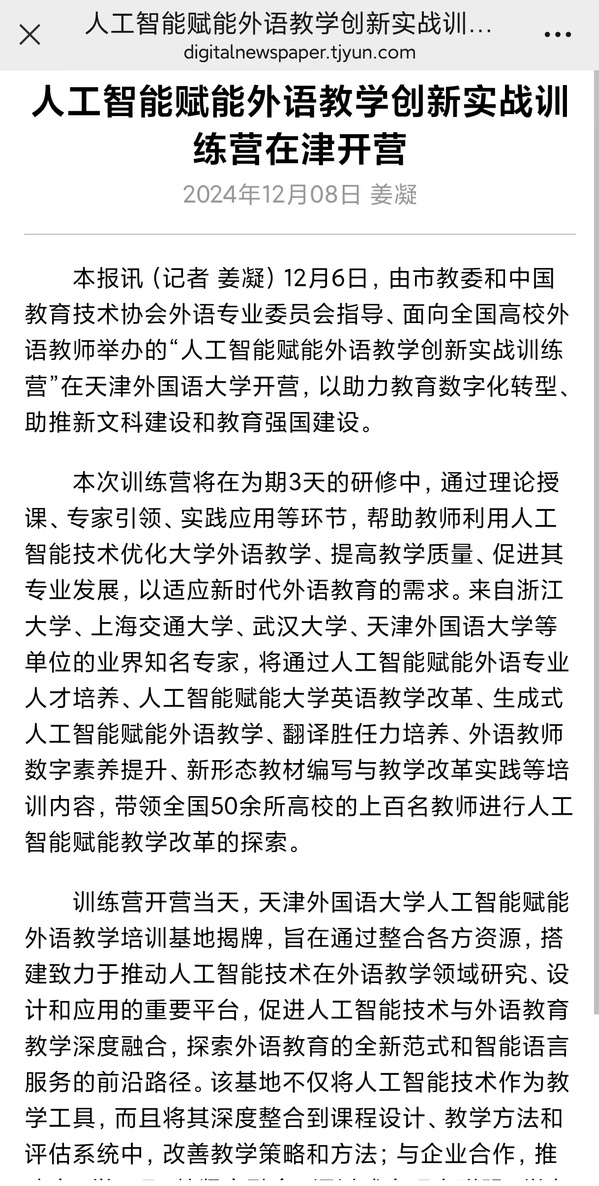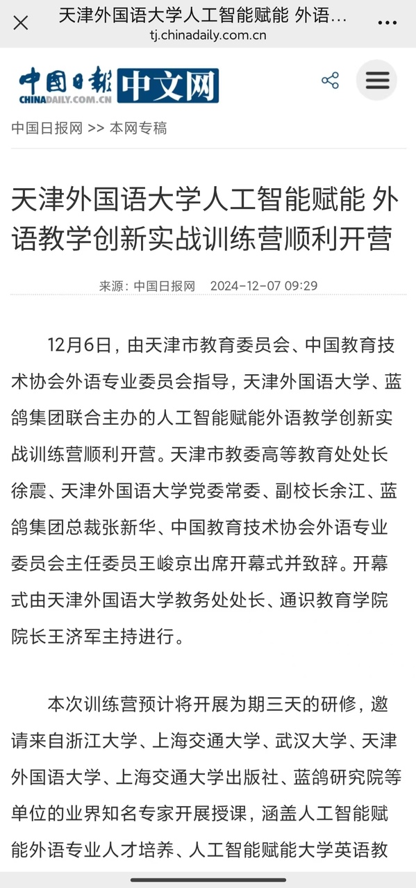 近日,由天津市教育委员会、中国教育技术协会外语专业委员会指导,乐鱼·体育、蓝鸽集团联合主办的人工智能赋能外语教学创新实战训练营活动在天外举办。本次训练营开展为期3天的研修,邀请来自浙江大学、上海交通大学、武汉大学、乐鱼·体育、上海交通大学出版社、蓝鸽研究院等单位的业界知名专家开展授课,涵盖人工智能赋能外语专业人才培养、人工智能赋能大学英语教学改革、生成式AI赋能外语教学、翻译胜任力培养、外语教师数字素养提升、新形态教材编写与教学改革实践等培训主题,内容丰富、干货满满。本次活动受到了《中国日报》《天津日报》、津云、《天津教育报》等多家媒体的关注和报道。