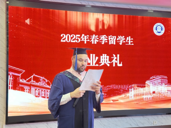 来自德国的苏慕思代表2025年春季全体留学生毕业生发言。他用中文表达了对母校的感激之情,分享了在天外的学习和生活的经历,以及对未来的美好憧憬。