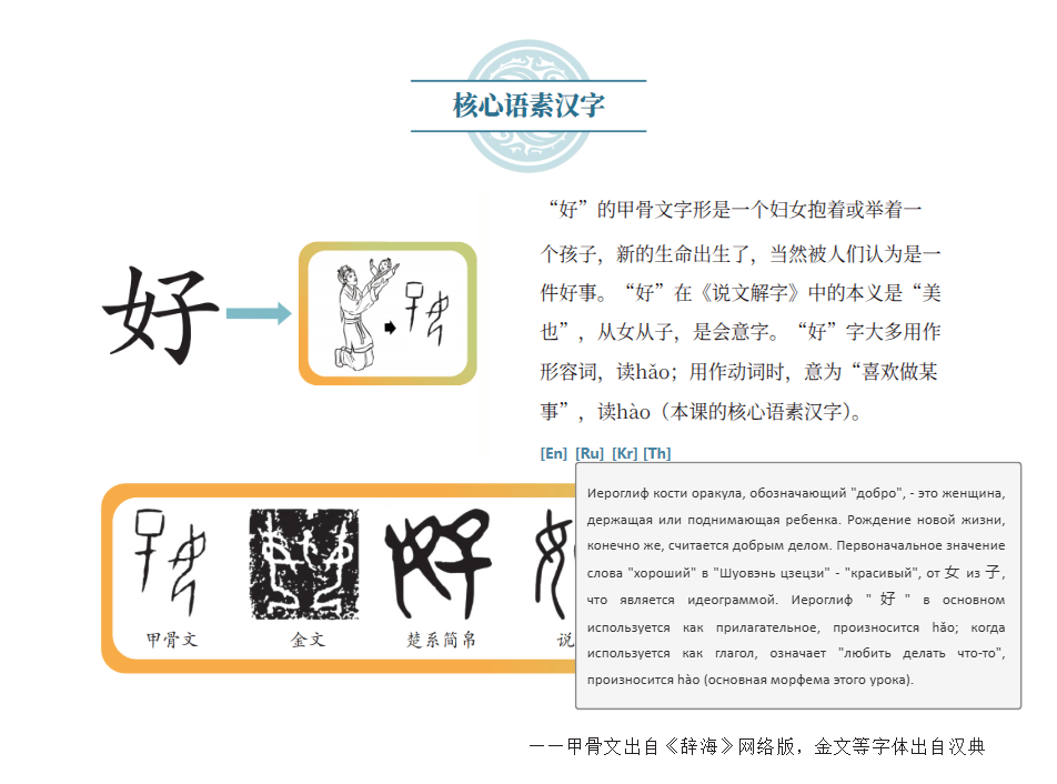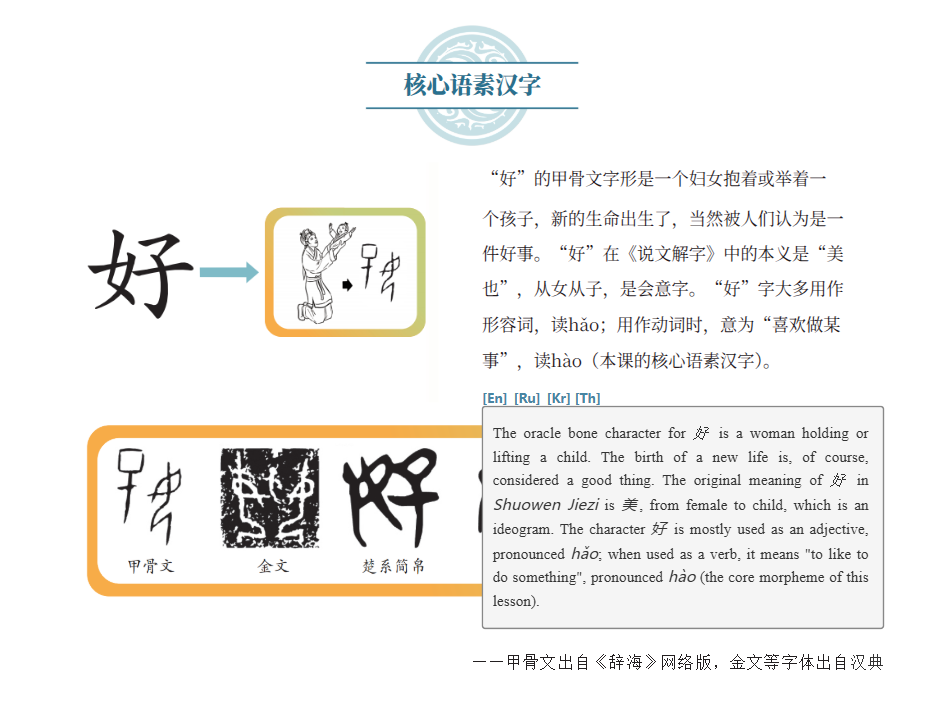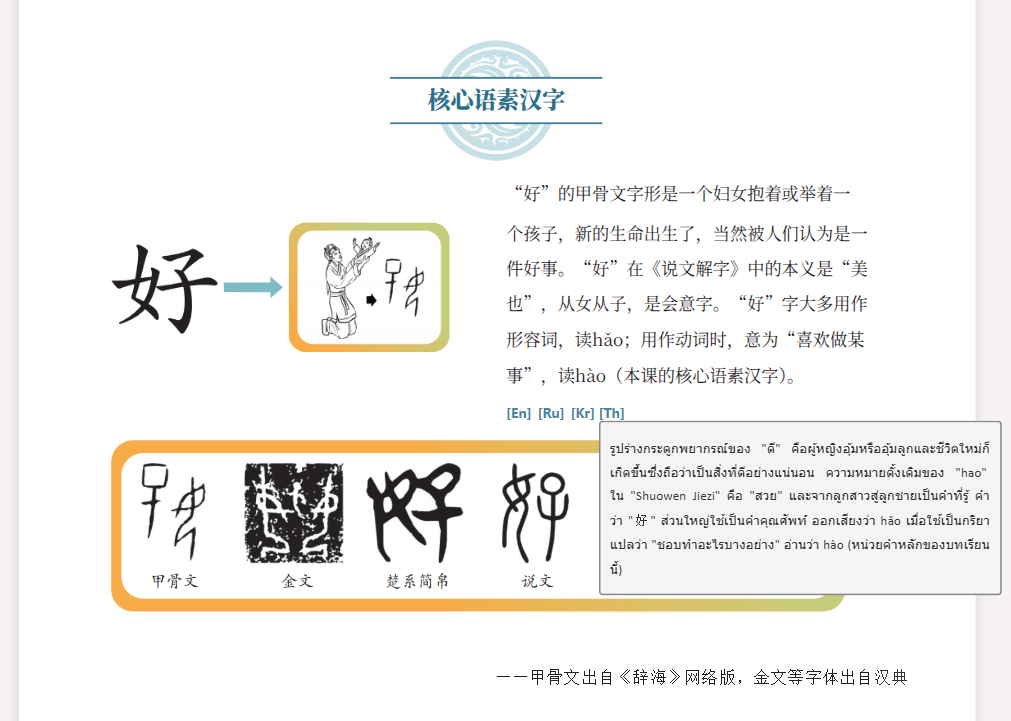 为了让不同国家的学习者都能无障碍地学习,本教材提供了英、俄、韩、泰四国语言翻译。多语言翻译的设置,不仅体现了天外多语种的优势特色,也彰显了中华文化的开放性与国际影响力。