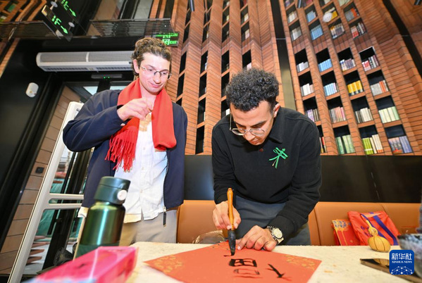 1月26日,丘山(右二)和留学生在天津意式风情区钟书阁书店内参加春节民俗体验活动。