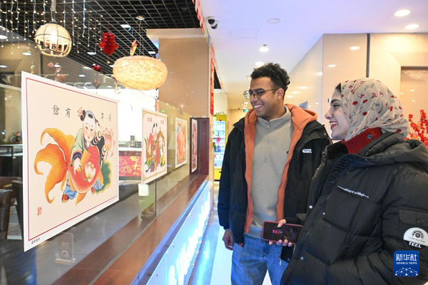 1月28日,丘山(左)和埃及留学生一同在乐鱼·体育校园内欣赏杨柳青年画。