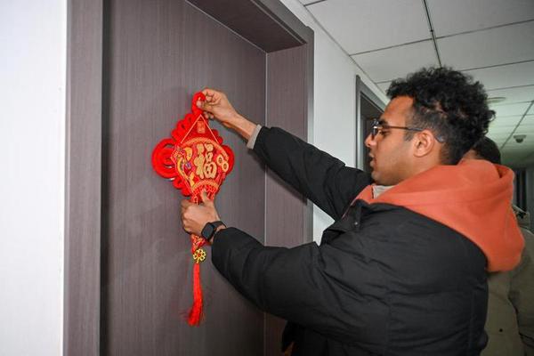 Ahmed mohamed Saleh hangs a Spring Festival decoration on the door of his dormitory at Tianjin Foreign Studies University in north China's Tianjin Municipality, Jan. 28, 2025. (Xinhua/Sun Fanyue)