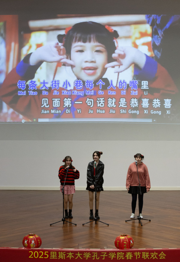 文艺表演环节高潮迭起,来自葡萄牙奥埃拉什小学的40名学生与圣托马斯孔子课堂的学生,用清澈童声演绎《新年好》《山村咏怀》和《静夜思》等歌曲,赢得了阵阵掌声。