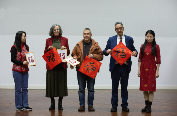 在“新春送祝福”文化展示环节,教师和留学生展示了剪纸和书法的艺术魅力,把“福”字作品赠送给了三位前任葡方院长,为他们送去了新春的祝福。
