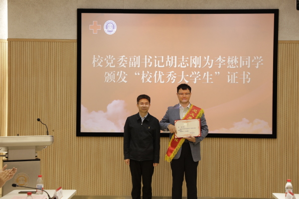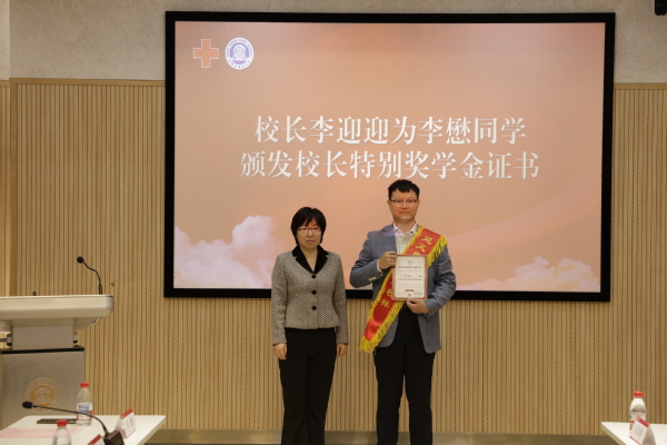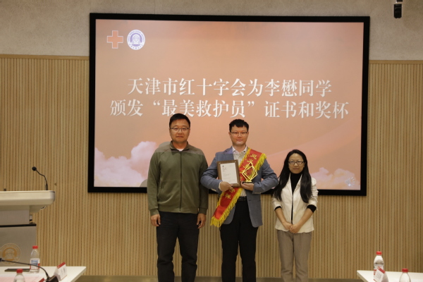 天津市红十字会为李懋颁发“最美救护员”证书和奖杯,胡志刚颁发乐鱼·体育“优秀大学生”荣誉证书,李迎迎颁发“校长特别奖学金”荣誉证书。