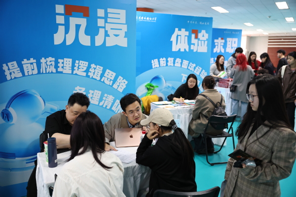 “AI模拟面试很适合像我一样性格比较内向的‘i人’,可以无限次模拟面试场景,还能一键生成面试报告,很方便。”活动现场,小张同学现场试用了学校引进的就业星“AI就业能力提升系统”。该系统帮助毕业生智能生成简历并精准进行诊断、润饰,模拟面试真题全面覆盖求职、考研、考公考编、教资等多类应用场景,数智人面试官真实、丰富,沉浸感强烈,可生成包含语言表达、逻辑思维、情绪管理等多项能力评估报告并给出改进建议,实现就业服务全流程数字化升级。双选会采用“线下对接+云端服务”双轨并行模式,通过河西区公共就业(人才)服务中心官方抖音号同步直播,企业线上实时解答求职疑问,覆盖更多潜在人才。
