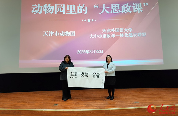 活动中,天津外大一体化建设联盟实践教学基地揭牌,岳阳道小学向动物园赠送天津市政协常委、市文联副主席、市美术家协会主席、岳阳道小学融慧教委会委员王书平的“熊猫馆”题字,三所学校学生代表赠送学生熊猫主题手绘作品,多方协力共同打造“育人共同体”。