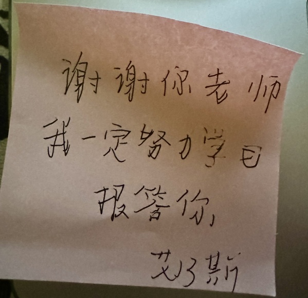 在一张便利贴上,艾乃斯写下了与刘雨桐的约定(央广网发受访者供图)