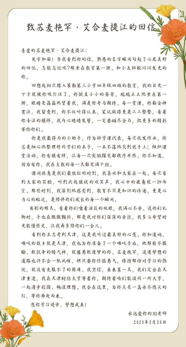 天津财经大学的教室里,阳光透过窗户洒在桌上,曾经参与援疆支教的刘闻宣正仔细阅读着苏麦艳罕的信件,嘴角不自觉地上扬。这封信,字里行间满是思念与成长的欣喜。