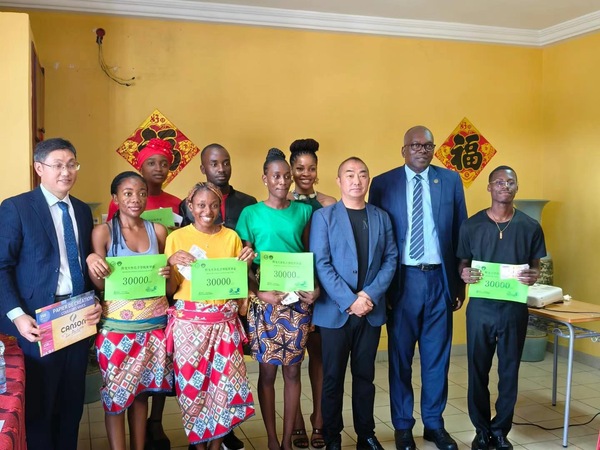 比赛结束后,中资企业欧来源(ORIGEN)水厂总经理毛苏雄先生为孔子学院艺术团的部分团员颁发了邦戈大学孔子学院奖学金,激励学生持之以恒学好汉语,以中法双语助力中加友好交流。