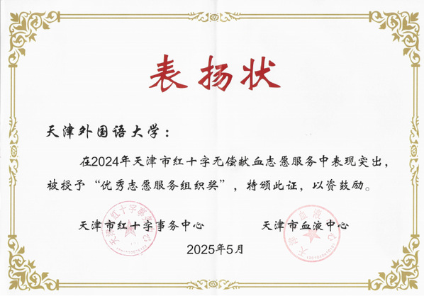 在第78个世界红十字日来临之际,天津市红十字会对2024年度天津市红十字系统“三救三献”工作突出单位予以通报表扬,我校在造血干细胞志愿捐献者招募工作和无偿献血志愿服务中成绩显著,获评2024年度天津市红十字系统“三献”工作突出单位和优秀志愿服务组织奖。