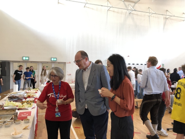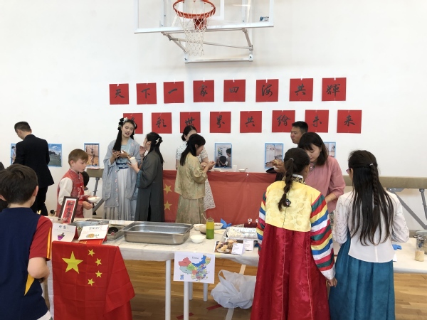 最后,学生们转场国际学校一楼大厅,品尝各国美食,体验异域文化风情。由华人协会提供的中华美食深受欢迎。