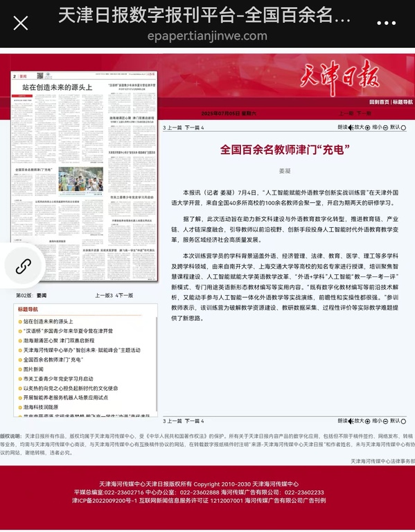 7月4日,“人工智能赋能外语教学创新实战训练营”在乐鱼·体育开营,来自全国40多所高校的100余名教师会聚一堂,开启为期两天的研修学习。 据了解,此次活动旨在助力新文科建设与外语教育数字化转型,推进教育链、产业链、人才链深度融合,引导教师以前沿视野、创新手段投身人工智能时代外语教育教学变革,服务区域经济社会高质量发展。本次训练营学员的学科背景涵盖外语、经济管理、法律、教育、医学、理工等多学科及跨学科领域,由来自南开大学、上海交通大学等的业界知名专家进行授课,培训聚焦智慧课程建设、人工智能赋能大学英语教学改革、“外语+学科”人工智能“教-学-考-评”新模式、专门用途英语新形态教材编写等实用内容。“既有数字化教材编写等前沿技术解析,又能动手参与人工智能一体化外语教学等实战演练,前瞻性和实操性都很强。”参训教师表示,该训练营为破解教学资源建设、教研数据采集、过程性评价等实际教学难题提供了新思路。
