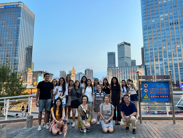 Portuguese students and the teacher take a photo by the Haihe River. [Photo provided to chinadaily.com.cn]