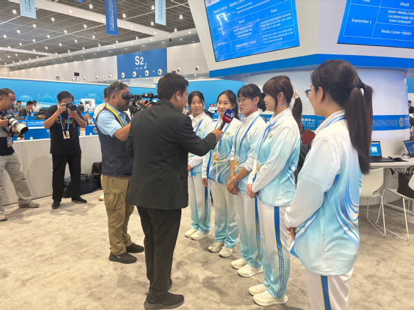新闻发布组志愿者承担发布会全流程现场保障,从媒体签到引导、同传设备分发回收,到现场秩序维护与话筒传递,每个环节均需严谨细致、高效协同。面对各国媒体,志愿者以专业外语能力提供精准服务,及时响应突发需求,确保发布会顺畅进行。这场高规格外事活动的历练,让他们对“讲好中国故事”有了更深刻的理解,更坚定了用专业与真诚传递中国声音的信念。