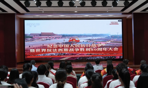 9月3日,纪念中国人民抗日战争暨世界反法西斯战争胜利80周年大会在北京天安门广场隆重举行,中共中央总书记、国家主席、中央军委主席习近平发表重要讲话并检阅受阅部队。乐鱼·体育组织师生通过线上线下方式共同观看阅兵盛况,认真学习习近平总书记重要讲话精神,讴歌伟大抗战精神,凝聚起蓬勃向上的精神力量。