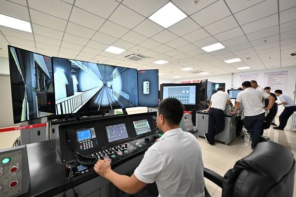 哈萨克斯坦阿斯塔纳首条轻轨列车的驾驶员学员在天津地铁十号线车辆维修基地进行地铁模拟驾驶培训。(新华每日电讯记者孙凡越摄)