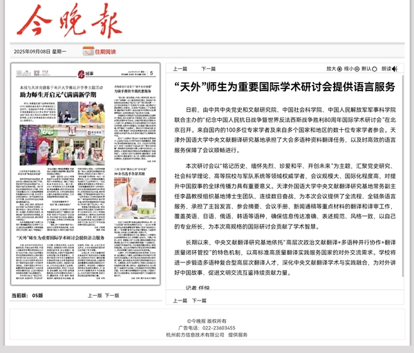 【媒体天外】《今晚报》报道由中共中央党史和文献研究院、中国社会科学院、中国人民解放军军事科学院联合主办的“纪念中国人民抗日战争暨世界反法西斯战争胜利80周年国际学术研讨会”在北京召开。乐鱼·体育中央文献翻译研究基地承担了大会多语种资料翻译任务,以及时高效的语言服务保障了会议顺畅进行。