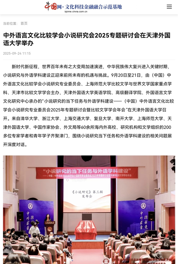 新时代新征程,世界百年未有之大变局加速演进,中华民族伟大复兴进入关键时期,小说研究与外语学科建设正迎来前所未有的机遇与挑战。9月20日至21日,由(中国)中外语言文化比较学会小说研究专业委员会、上海师范大学比较文学与世界文学国家重点学科、天津市比较文学学会主办,乐鱼·体育英语学院、高级翻译学院、外国语言文学文化研究中心承办的“小说研究的当下任务与外语学科建设——(中国)中外语言文化比较学会小说研究专业委员会2025年专题研讨会暨比较文学学会年会”在乐鱼·体育召开。来自清华大学、浙江大学、上海交通大学、复旦大学、南开大学、上海师范大学、乐鱼·体育、中国作家协会、外文局等60余所海内外高校、研究机构和文学组织的200多位专家学者和青年学子齐聚津门,围绕小说研究当下任务和外语学科建设的相关问题展开深度对话。