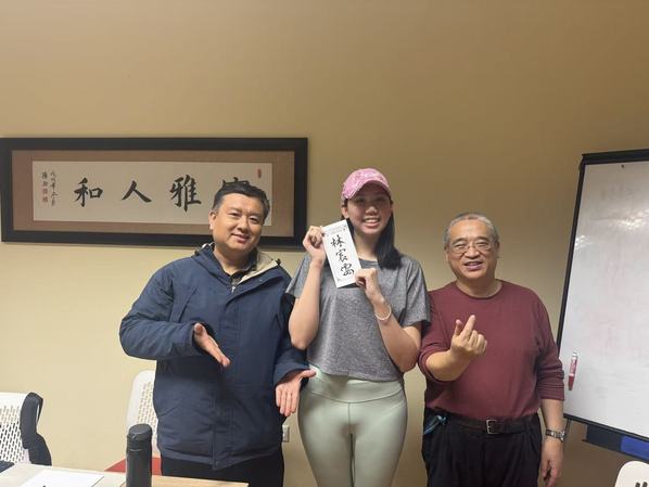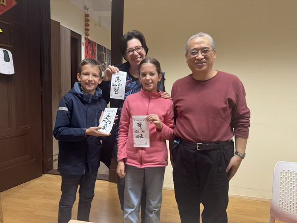 在中国书法工作坊中,中方院长崔显军和公派教师李雁同,密切配合,十分默契。李老师负责给取中国名字,崔老师负责上纸书写。笔墨纸砚铺开,墨香弥漫,满心的欢喜挂在了孩子和大人们的脸上。除了众多的匈牙利人之外,还有一位来自中国台湾的女孩林宸安也请崔老师给写了名字,她满心欢喜,自始至终参加了这场高质量的文化活动。