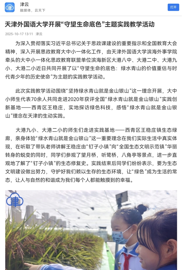 为深入贯彻落实习近平总书记关于思政课建设的重要指示和全国教育大会精神,深入开展思政教育大中小一体化工作,由乐鱼·体育滨海外事学院牵头的大中小一体化思政教育联盟单位滨海新区大港八中、大港二中、大港九小、大港二小近日共同开展了以“守望生命的底色:绿水青山的价值重估与时代青少年的历史使命”为主题的实践教学活动。