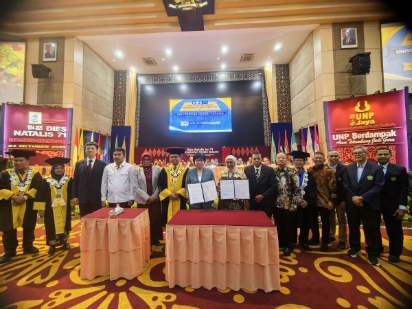 致辞结束后,我校与印尼邦哈达大学签署合作协议。印尼高等教育、科学与技术部代表吉吉·斯丽·加扬达丽,西苏门答腊省副省长法斯克·卢赛米、印尼驻华使馆教育参赞李健、巴东国立大学校长克里斯·马迪纳塔,中国驻印尼使馆教育参赞陈武、驻棉兰总领馆总领事黄河,我校校长李迎迎等共同为巴东国立大学孔子学院和中国学研究中心揭牌,并实地参观了两个机构的教育教学设施和环境。