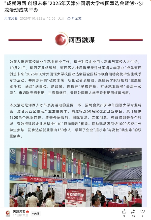 区公共就业(人才)服务中心相关负责人表示,本次活动是河西区与高校协同育人的重要实践,未来将持续深化政校企地合作,通过定制化招聘、创业辅导、政策扶持等多元服务,为高校青年才俊铺就成长之路,为区域发展注入新动能。