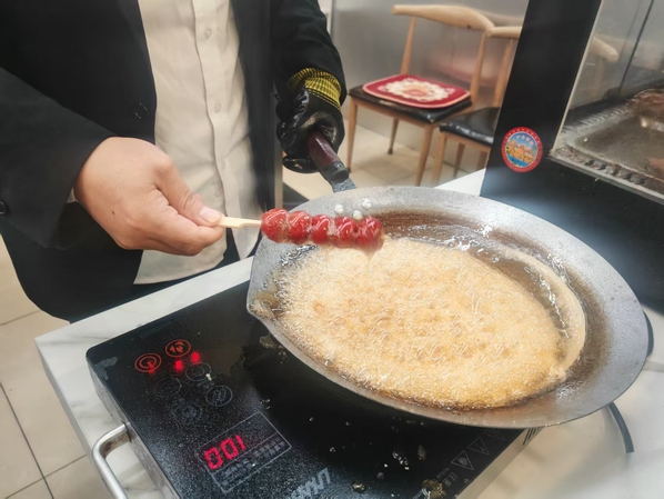 经过校园物业一年的精心培育,山楂挂满枝头,校园物业师傅们将新鲜采摘、色泽饱满的山楂送往学生食堂,由食堂的厨师们给这些红果“洗澡”“裹糖衣”,制作成一串串酸甜可口的冰糖葫芦。于11月4日至5日晚餐时段,将这些充满心意的冰糖葫芦免费送给前来就餐的师生。