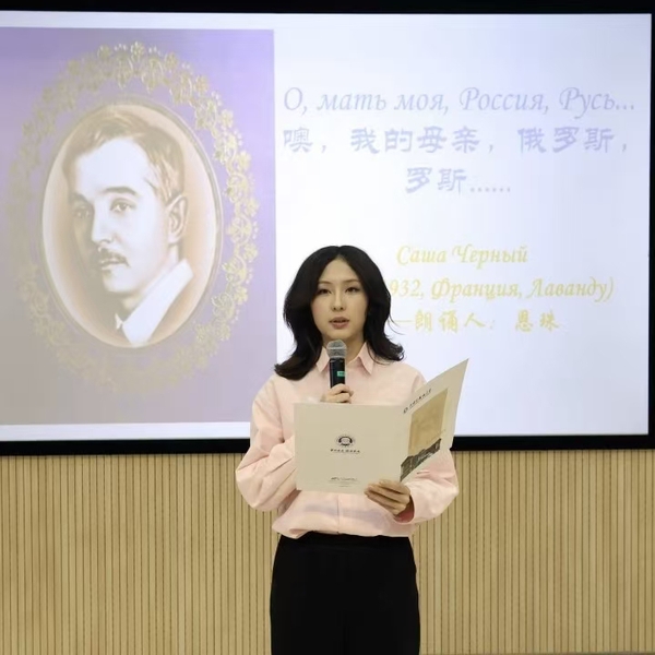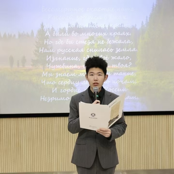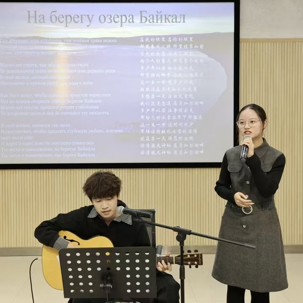 天外学子带来精彩纷呈的文艺节目。蒋逸潇、恩珠分别朗诵了中俄经典诗歌《祖国》《噢,我的母亲,俄罗斯,罗斯……》;付家齐以二胡独奏串烧《莫斯科郊外的晚上》《赛马》,赢得阵阵掌声;刘锦添、于怡然合作的吉他弹唱《贝加尔湖畔》将现场气氛推向高潮,展现了中俄文化交融的独特魅力。