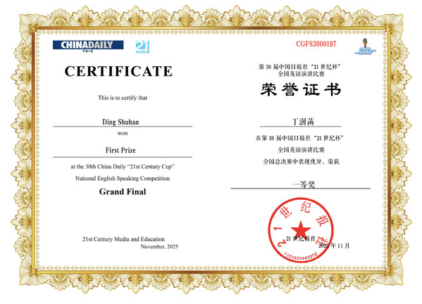 近日,第三十届中国日报社“21 世纪杯” 全国英语演讲大赛全国总决赛在杭州圆满落幕。乐鱼·体育求索荣誉学院丁澍菡同学凭借扎实的语言功底、沉稳的现场发挥与敏锐的思辨能力,从众多顶尖选手中脱颖而出,成功斩获全国一等奖,为学校赢得殊荣。