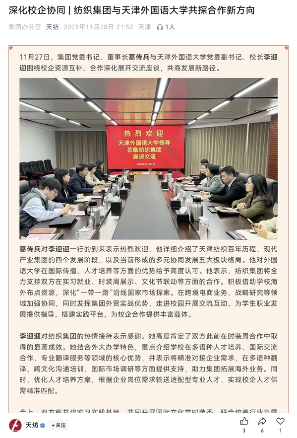葛传兵对李迎迎一行的到来表示热烈欢迎,他详细介绍了天津纺织百年历程、现代产业集团的四个发展阶段,以及当前形成的多元协同发展五大板块格局。他对外国语大学在国际传播、人才培养等方面的优势给予高度认可。他表示,纺织集团将全力支持双方在实习就业、时装周展示、文化节联动等方面的合作。积极借助学校海外布点资源,深化“一带一路”沿线国家市场探索。在跨境电商业务、战略研究等领域加强协同,同时发挥集团外贸实战优势,走进校园开展交流互动,为学生职业发展提供指导,搭建实践平台,为校企合作提供丰富载体。