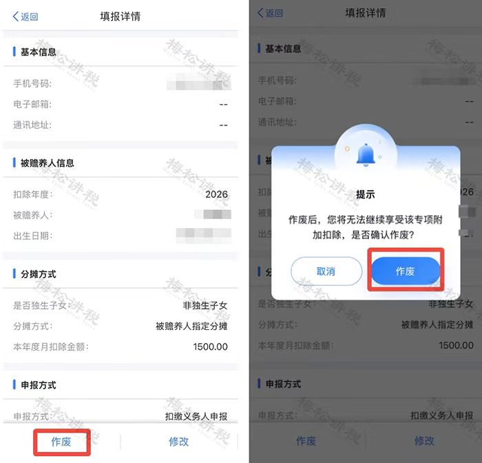②点击进入想要作废的专项附加扣除项目。点击左下角【作废】,确认作废后,即可作废成功。