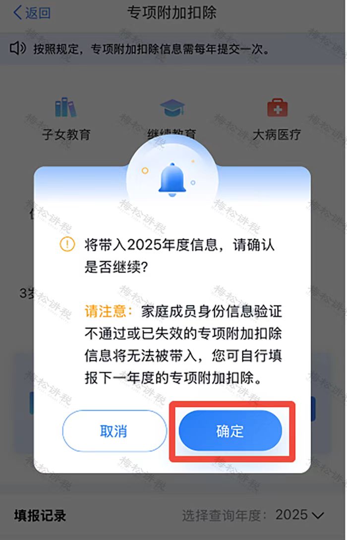 ②依据提示“将带入2025年度信息,请确认是否继续?”确认无误,后点击【确定】。如下图: