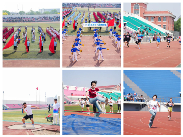 田径赛场,学子践行“更快、更高、更强——更团结”精神:赛道上全力冲刺,跳高场挑战极限,志愿者与师生同心协力,呐喊声中尽显青春力量。