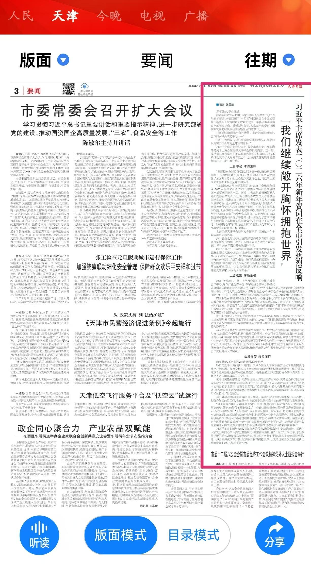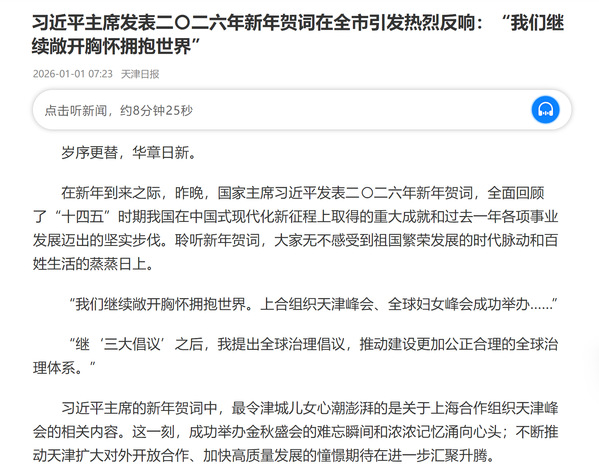 习近平主席的新年贺词中,最令津城儿女心潮澎湃的是关于上海合作组织天津峰会的相关内容。这一刻,成功举办金秋盛会的难忘瞬间和浓浓记忆涌向心头;不断推动天津扩大对外开放合作、加快高质量发展的憧憬期待在进一步汇聚升腾。