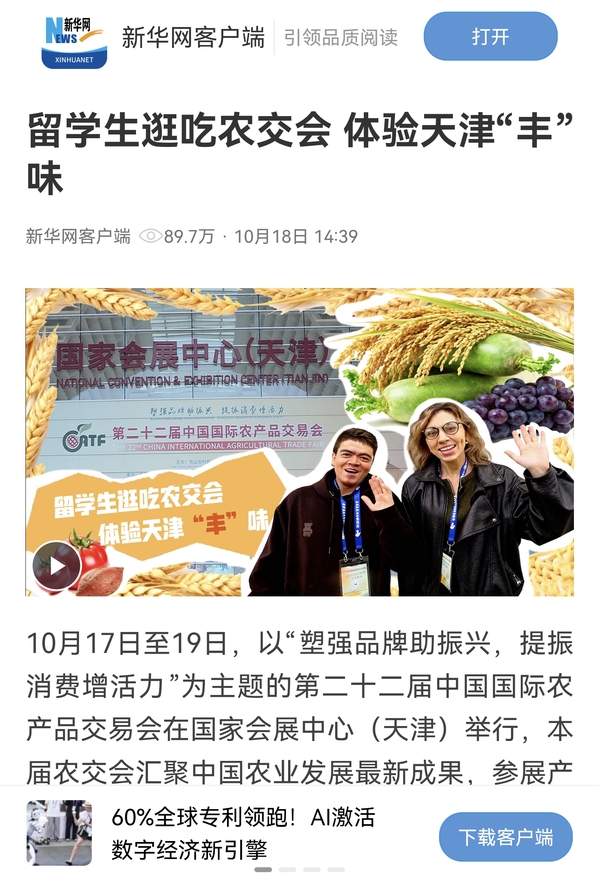 10月17日至19日,以“塑强品牌助振兴,提振消费增活力”为主题的第二十二届中国国际农产品交易会在国家会展中心(天津)举行,本届农交会汇聚中国农业发展最新成果,参展产品约2.5万种,展览面积超10万平方米。天津展区里,沙窝萝卜、小站稻、津味厨房……各式各样具备天津特色的农产品齐聚一堂,好吃又好逛。跟随来自俄罗斯和危地马拉的两位乐鱼·体育留学生走进农交会现场,一站式领略中国农业的蓬勃气象,沉浸式体验天津“丰”味。新闻来源:https://my-h5news.app.xinhuanet.com/h5/article.html?articleId=d90370e14169fc06a4022baf
