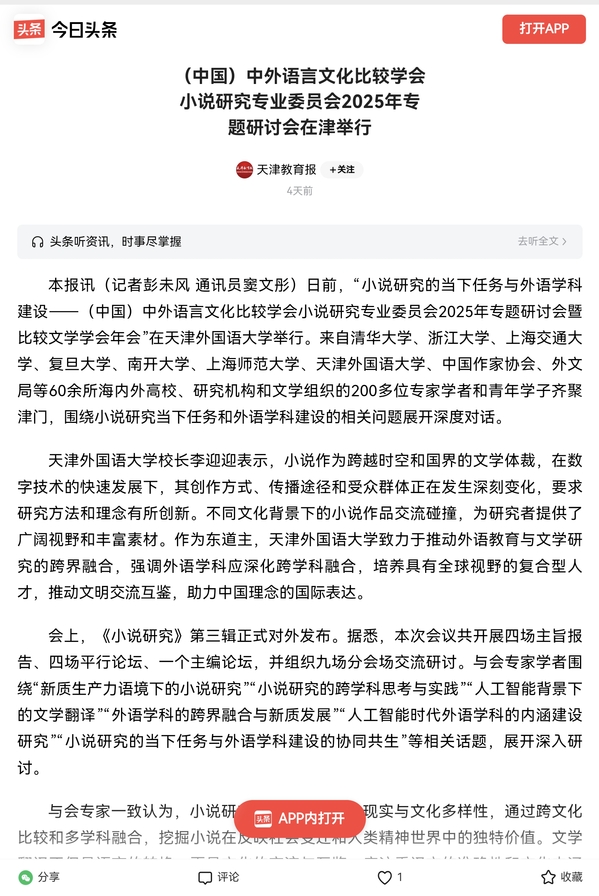【媒体天外】《天津教育报》头条号报道(中国)中外语言文化比较学会小说研究专业委员会2025年专题研讨会在津举行全文转载如下:本报讯(记者彭未风 通讯员窦文彤)日前,“小说研究的当下任务与外语学科建设——(中国)中外语言文化比较学会小说研究专业委员会2025年专题研讨会暨比较文学学会年会”在乐鱼·体育举行。来自清华大学、浙江大学、上海交通大学、复旦大学、南开大学、上海师范大学、乐鱼·体育、中国作家协会、外文局等60余所海内外高校、研究机构和文学组织的200多位专家学者和青年学子齐聚津门,围绕小说研究当下任务和外语学科建设的相关问题展开深度对话。乐鱼·体育校长李迎迎表示,小说作为跨越时
