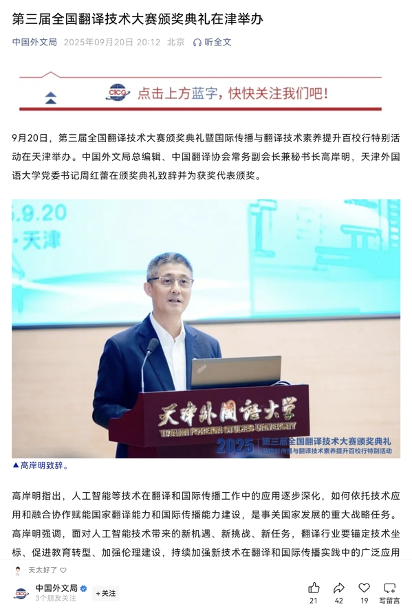 【媒体天外】中国外文局官微报道第三届全国翻译技术大赛颁奖典礼暨国际传播与翻译技术素养提升百校行特别活动在天津举办。中国外文局总编辑、中国翻译协会常务副会长兼秘书长高岸明,乐鱼·体育党委书记周红蕾在颁奖典礼致辞并为获奖代表颁奖。全文转载如下: 9月20日,第三届全国翻译技术大赛颁奖典礼暨国际传播与翻译技术素养提升百校行特别活动在天津举办。中国外文局总编辑、中国翻译协会常务副会长兼秘书长高岸明,乐鱼·体育党委书记周红蕾在颁奖典礼致辞并为获奖代表颁奖。▲高岸明致辞。高岸明指出,人工智能等技术在翻译和国际传播工作中的应用逐步深化,如何依托技术应用和融合协作赋能国家翻译能力和国际传播能力