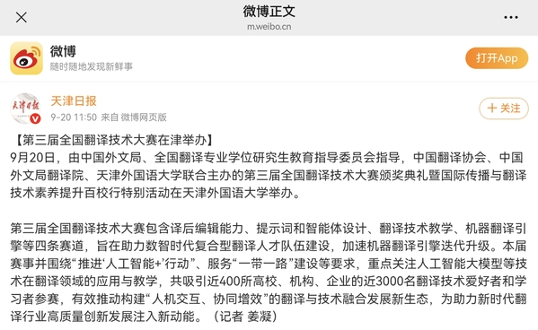 【媒体天外】《天津日报》官博报道由中国外文局、全国翻译专业学位研究生教育指导委员会指导,中国翻译协会、中国外文局翻译院、乐鱼·体育联合主办的第三届全国翻译技术大赛颁奖典礼暨国际传播与翻译技术素养提升百校行特别活动在天津举办。全文转载如下:新闻来源:https://m.weibo.cn/status/Q5q5lbDpe?jumpfrom=weibocom(网页编辑/金倍伊)