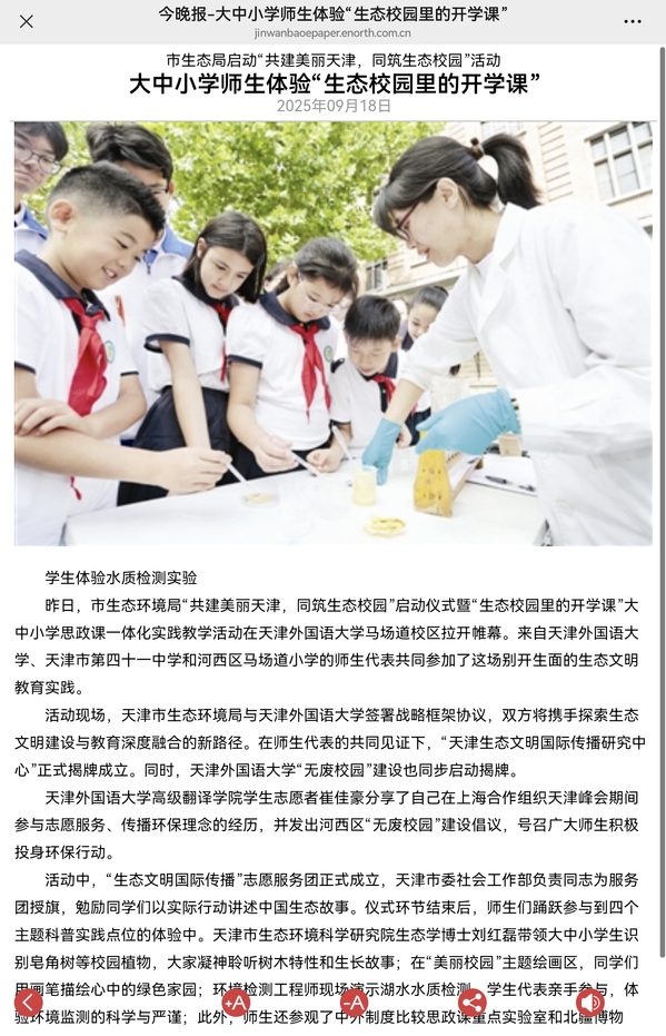 【媒体天外】《今晚报》报道市生态环境局“共建美丽天津,同筑生态校园”启动仪式暨“生态校园里的开学课”大中小学思政课一体化实践教学活动在乐鱼·体育马场道校区拉开帷幕。全文转载如下:学生体验水质检测实验昨日,市生态环境局“共建美丽天津,同筑生态校园"启动仪式暨“生态校园里的开学课”大中小学思政课一体化实践教学活动在乐鱼·体育马场道校区拉开帷幕。来自乐鱼·体育、天津市第四十一中学和河西区马场道小学的师生代表共同参加了这场别开生面的生态文明教育实践。活动现场,天津市生态环境局与乐鱼·体育签署战略框架协议,双方将携手探索生态文明建设与教育深度融合的新路径。在师生代表的共同见证下,“天津生