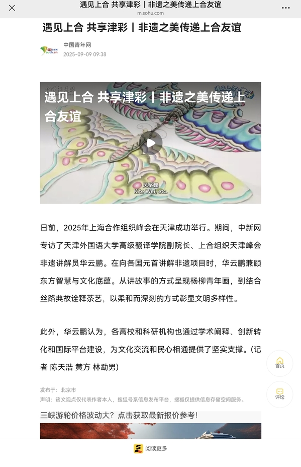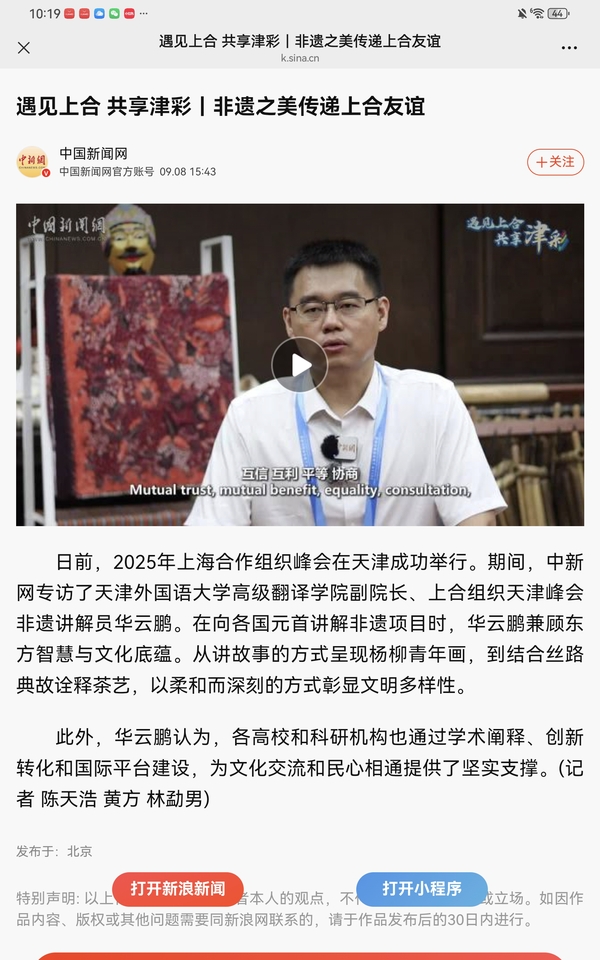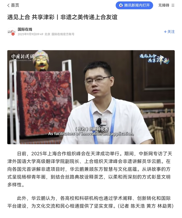 【相约上合】上合峰会期间,中新社专访了我校高级翻译学院副院长、上合组织天津峰会非遗讲解员华云鹏。报道通过中新社全媒体平台发布,并由中央网信办向全网推送。报道指出,在向各国元首讲解非遗项目时,华云鹏兼顾东方智慧与文化底蕴。从讲故事的方式呈现杨柳青年画,到结合丝路典故诠释茶艺,以柔和而深刻的方式彰显文明多样性。他认为,各高校和科研机构也通过学术阐释、创新转化和国际平台建设,为文化交流和民心相通提供了坚实支撑。全文转载如下:日前,2025年上海合作组织峰会在天津成功举行。期间,中新网专访了乐鱼·体育高级翻译学院副院长、上合组织天津峰会非遗讲解员华云鹏。在向各国元首讲解非遗项目时,华云鹏兼顾东方智
