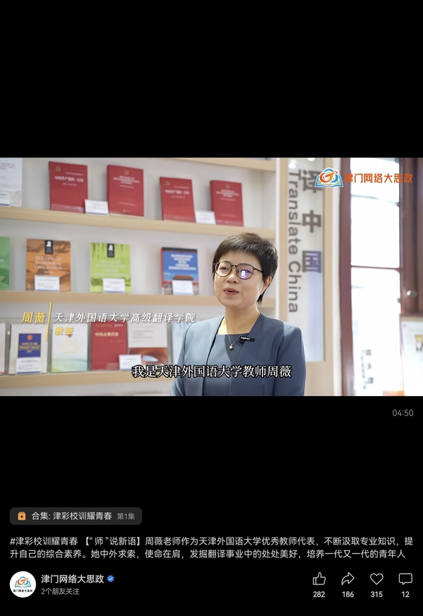 【媒体天外】“津门网络大思政”视频号 【“师”说新语】栏目报道我校教师周薇,不断汲取专业知识,提升自己的综合素养。她中外求索,使命在肩,发掘翻译事业中的处处美好,培养一代又一代的青年人才。全文转载如下:新闻来源:津门网络大思政视频号(网页编辑/金倍伊)