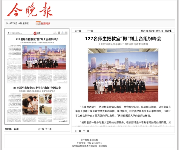 【相约上合】《今晚报》报道127名师生把教室“搬”到上合组织峰会 天外教师团队分享收获 11种语言传递中国声音全文转载如下:  “在重大活动中,从现场实际情况出发,结合专业知识,临场解决问题,这可能是在讲台上很难让学生直观感受到的内容。通过实践,我们自己提升专业水平的同时,也能让学生体会到什么才是真正的学以致用。”乐鱼·体育的老师这样说。  “能和老师一起参与重大活动的志愿服务,在实际场景中看到老师如何处理问题,如何灵活运用专业知识,能更深地理解,翻译不仅是一种语言的表达,更是情感的交流。”乐鱼·体育的学生这样说。  在近日闭幕的“2025年上合组织峰会”上,127名来自天津外国语大