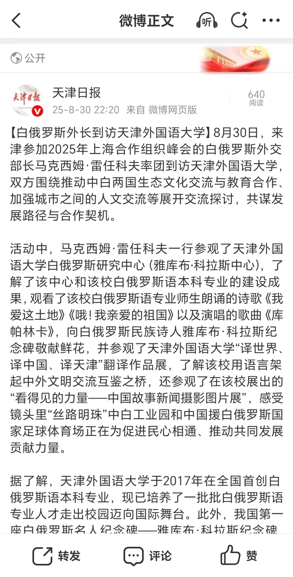 【相约上合】《天津日报》上合峰会专版、视频号、官方微博报道白俄罗斯外长到访我校全文转载如下:【白俄罗斯外长到访乐鱼·体育】8月30日,来津参加2025年上海合作组织峰会的白俄罗斯外交部长马克西姆·雷任科夫率团到访乐鱼·体育,双方围绕推动中白两国生态文化交流与教育合作、加强城市之间的人文交流等展开交流探讨,共谋发展路径与合作契机。活动中,马克西姆·雷任科夫一行参观了乐鱼·体育白俄罗斯研究中心(雅库布∙科拉斯中心),了解了该中心和该校白俄罗斯语本科专业的建设成果,观看了该校白俄罗斯语专业师生朗诵的诗歌《我爱这土地》《哦!我亲爱的祖国》以及演唱的歌曲《库帕林卡》,向白俄罗斯民族诗人雅库布